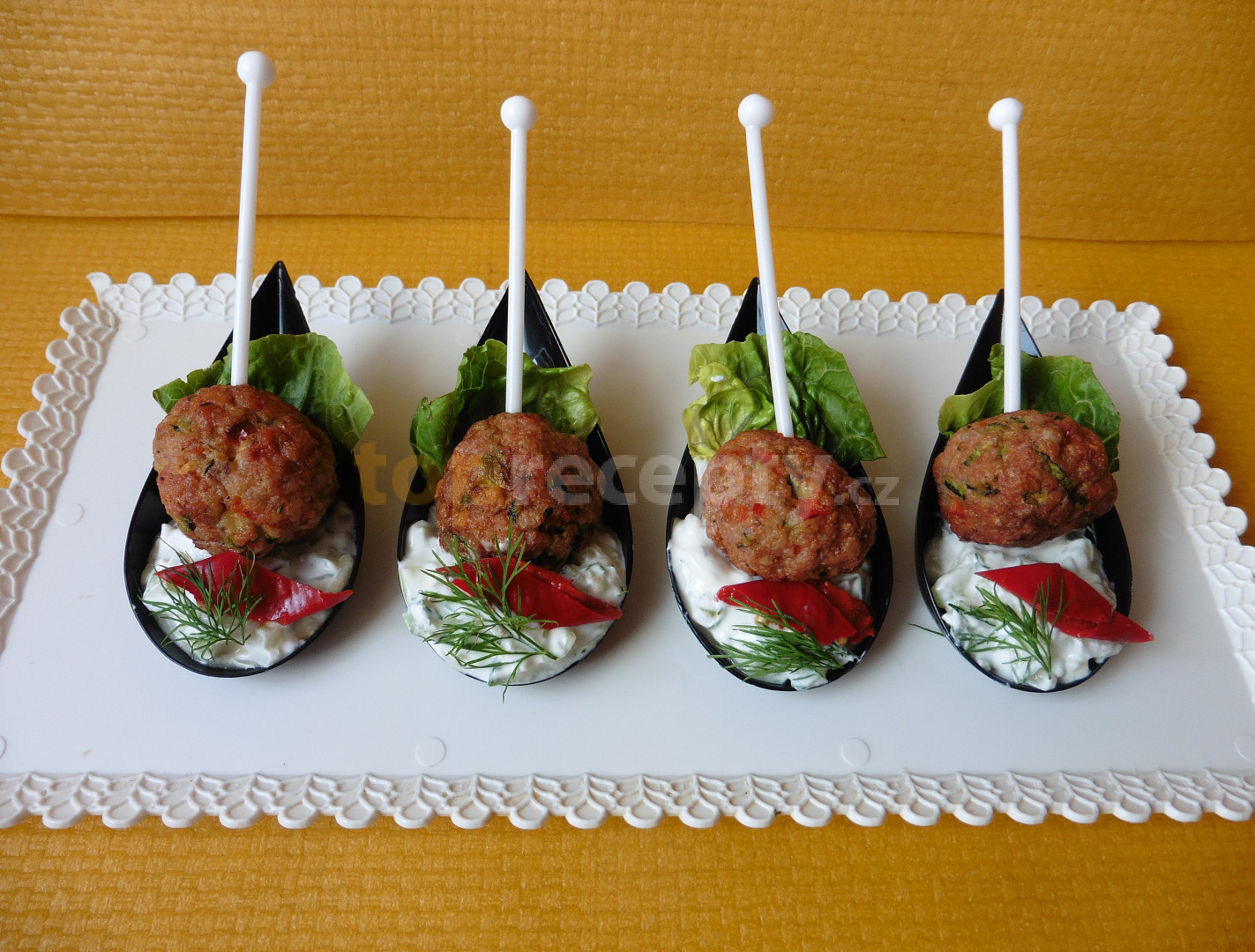 maso vepřové, cuketa, paprika čerstvá červená, vejce, cibule, sůl, koření do mletého masa, česnek, strouhanka, olej, okurka salátová, tvaroh plnotučný, kopr, šťáva citronová, sůl, pepř mletý, česnek, paprika kozí roh, listy salátové, kopr