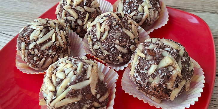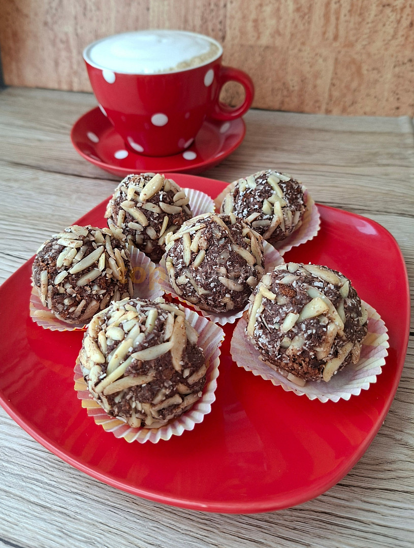 vejce, jogurt bílý, kokos mletý, mouka mandlová, ořechy mleté, kypřící prášek do pečiva, rum, máslo, sirup, kakao, kokos mletý, mandle mleté, ořechy mleté, kakao