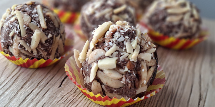 vejce, jogurt bílý, kokos mletý, mouka mandlová, ořechy mleté, kypřící prášek do pečiva, rum, máslo, sirup, kakao, kokos mletý, mandle mleté, ořechy mleté, kakao