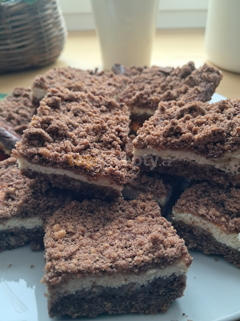 mouka polohrubá, kakao, kypřící prášek do pečiva, máslo, cukr moučkový, mléko, tvaroh měkký, mléko, vejce, cukr vanilkový, cukr krupice
