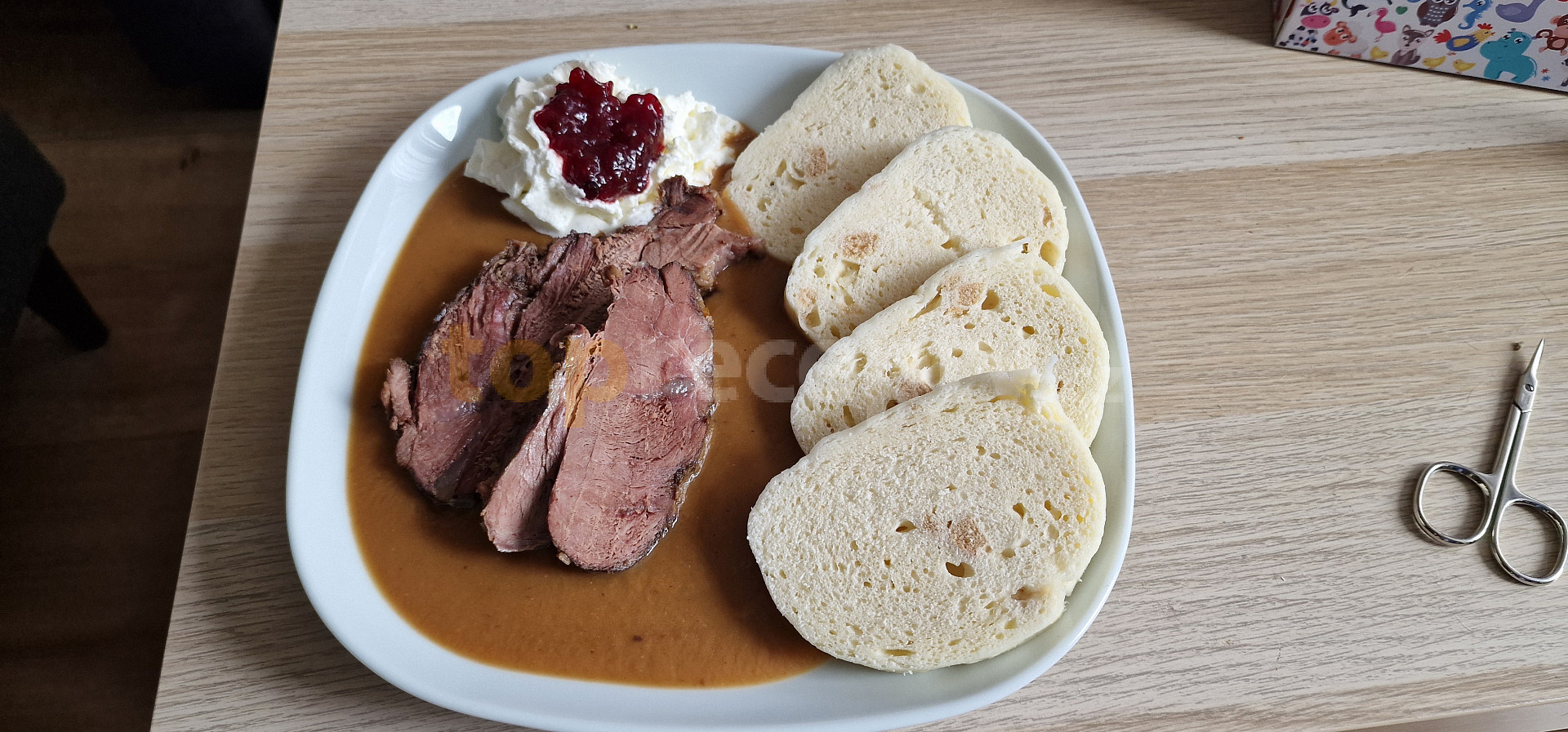 maso kančí, mrkev, celer, petržel, cibule, povidla švestková, marmeláda šípková, cukr, ocet, pepř černý, koření nové koření, jalovec, vejce, tymián čerstvý, víno červené, máslo, sádlo, jíška máslová, sůl, smetana