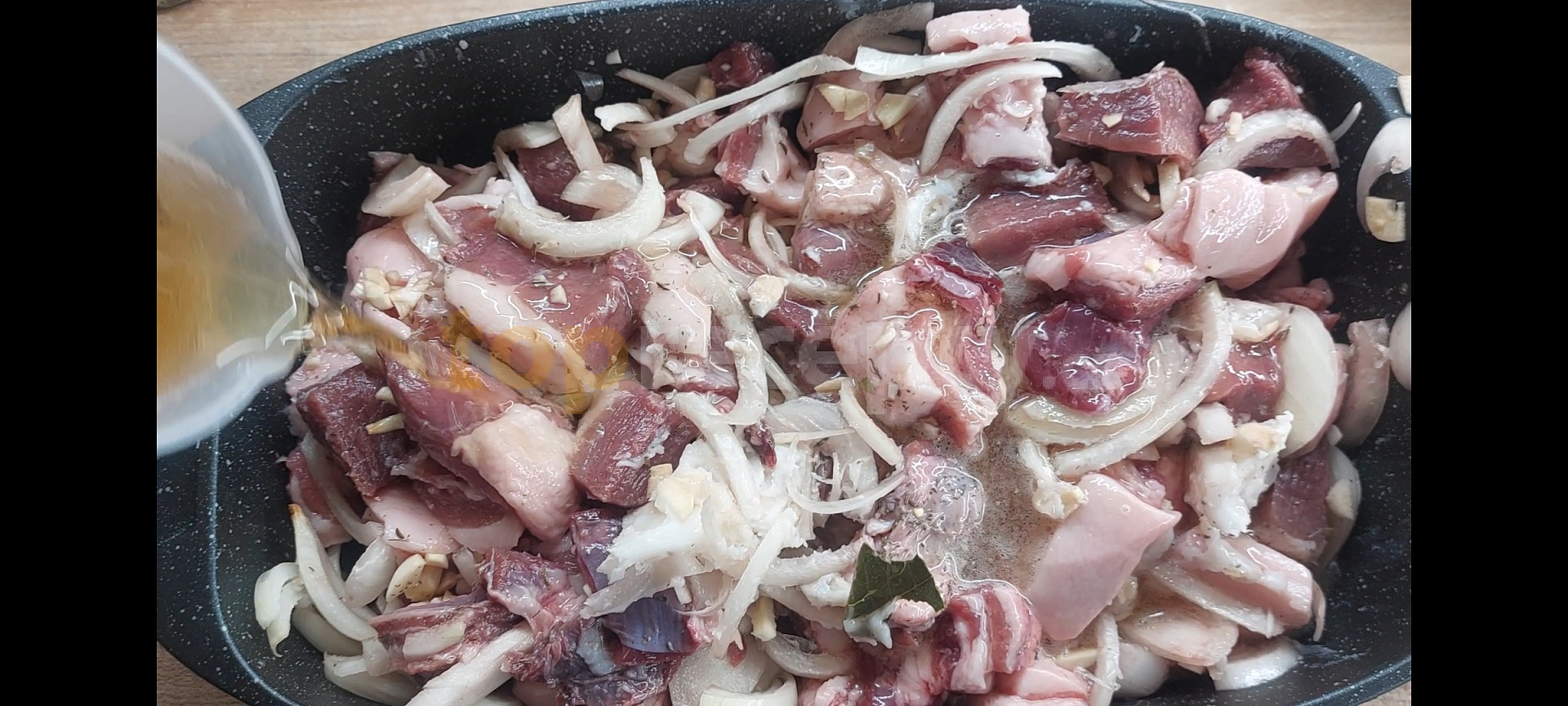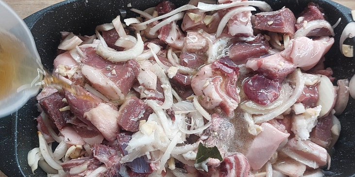 maso kančí, cibule, česnek, pivo černé, sádlo, tymián, koření nové koření, bobkový list, kmín celý, sůl, pepř mletý