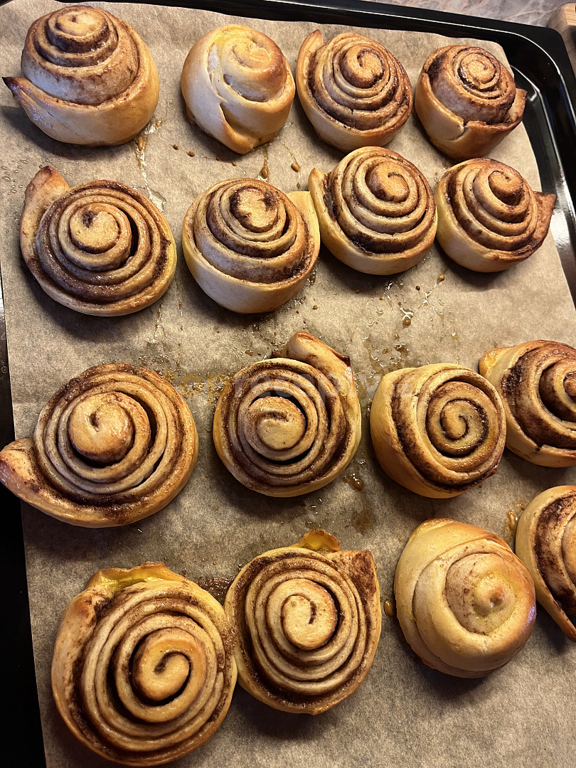 mléko, cukr moučkový, droždí, mouka hladká, sůl, máslo, cukr moučkový, máslo, cukr krystal, skořice, vejce, cukr krystal