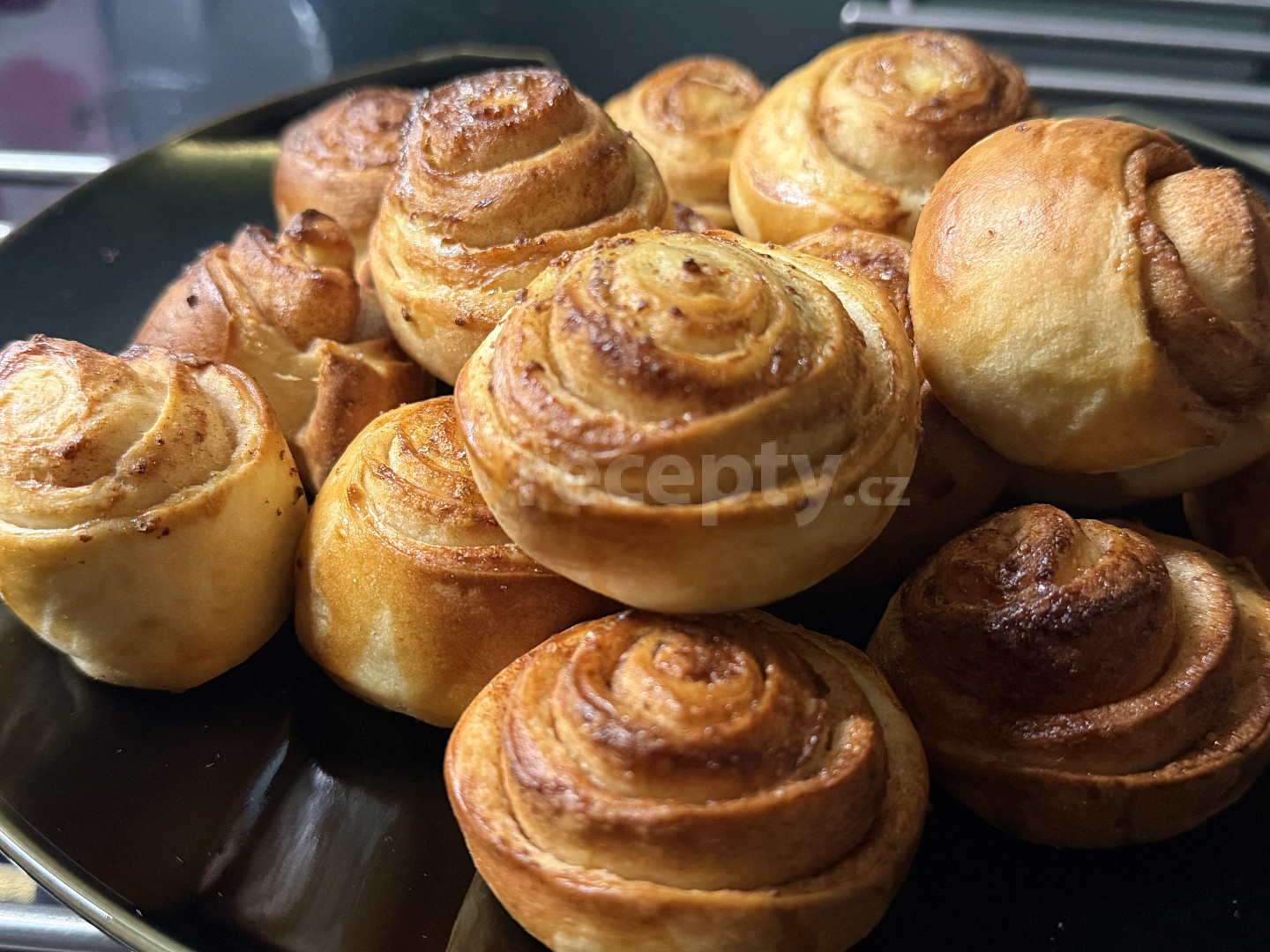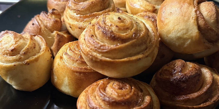 mléko, cukr moučkový, droždí, mouka hladká, sůl, máslo, cukr moučkový, máslo, cukr krystal, skořice, vejce, cukr krystal