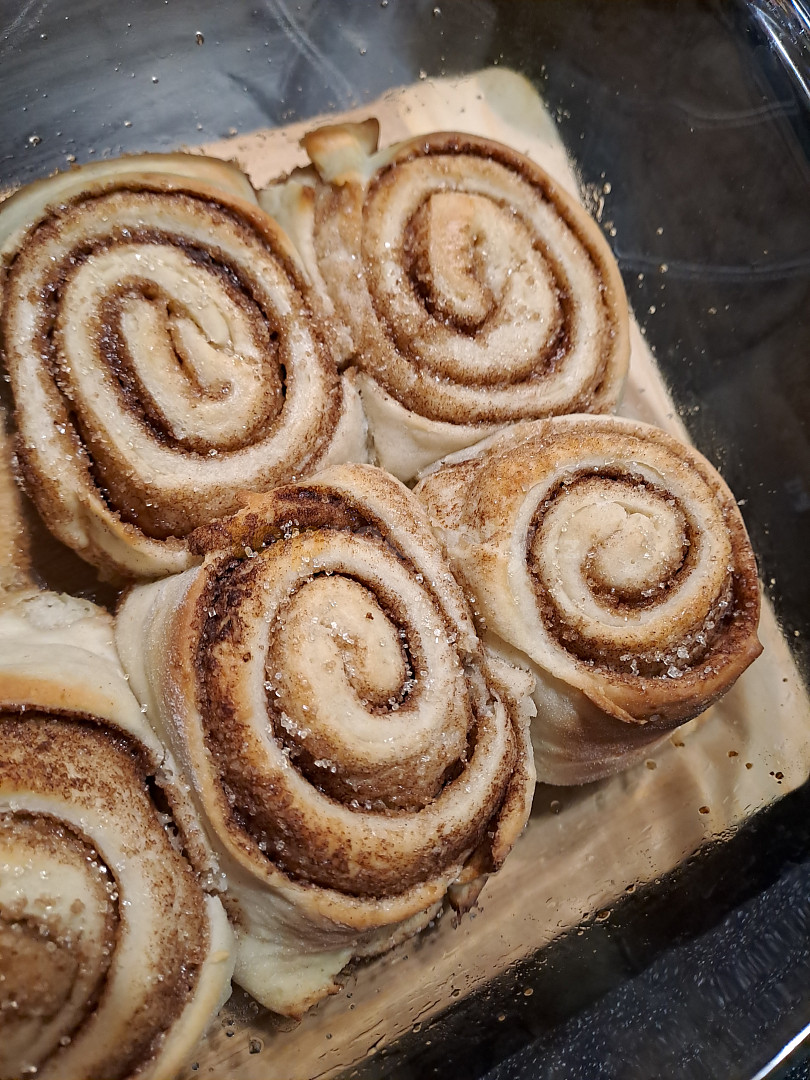 mléko, cukr moučkový, droždí, mouka hladká, sůl, máslo, cukr moučkový, máslo, cukr krystal, skořice, vejce, cukr krystal