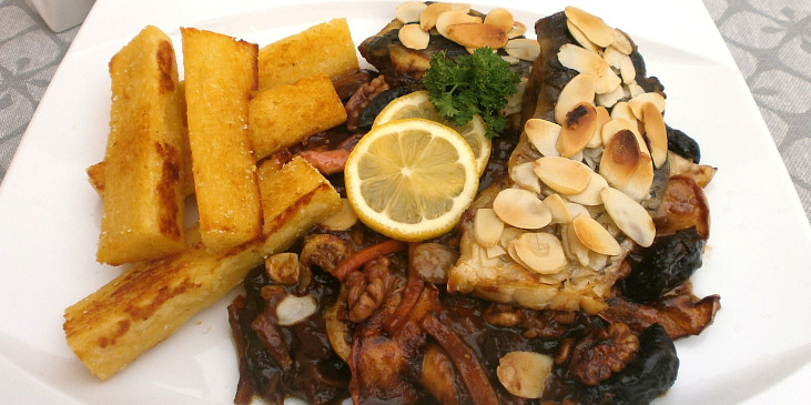 kapr, máslo, zelenina kořenová, cibule, pivo černé, ocet, povidla švestková, cukr krupice, sůl, pepř celý, bobkový list, koření nové koření, perník, rozinky, švestky sušené, ořechy vlašské, mandle loupané, kůra citronová