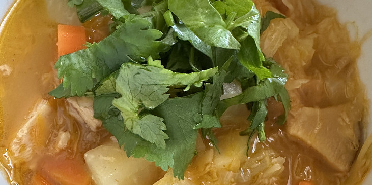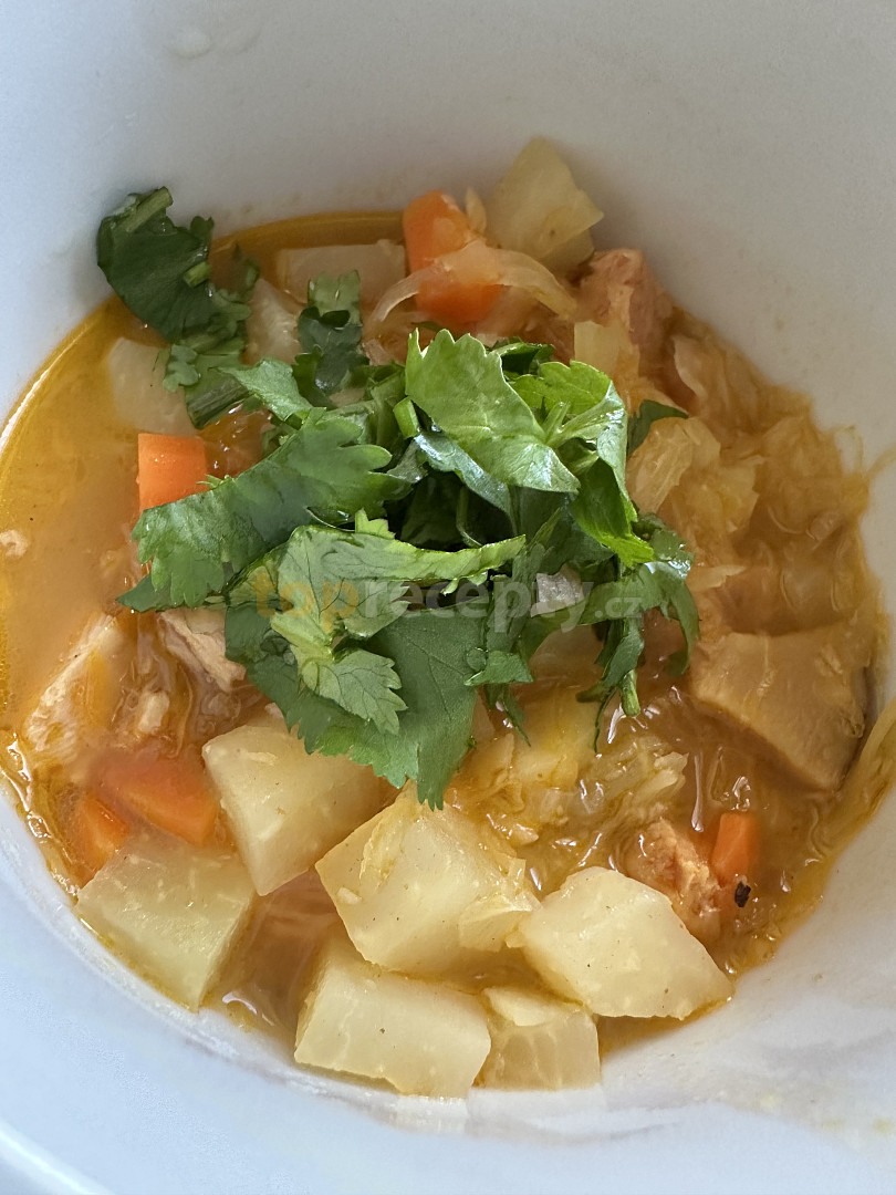 zelí kysané, voda, klobása uzená, maso uzené, plec vepřová, brambory, zelenina kořenová, houby sušené, česnek, cibule, pepř černý, paprika sušená sladká, kmín celý, sůl, mouka hladká, máslo, cibule