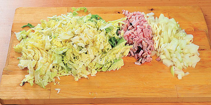 kapusta, vývar kuřecí, smetana na vaření, cibule, maso uzené, česnek, olej, mouka hladká, kmín drcený, pepř mletý, sůl, žemle, máslo