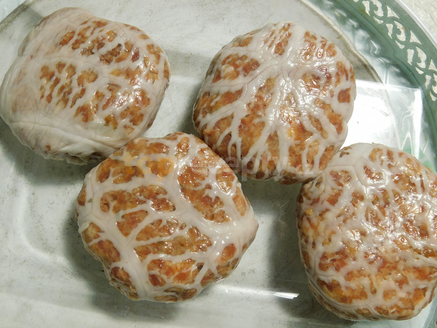 maso vepřové mleté, sýr tvarůžky kulaté, cibule sušená, vejce, česnek, hořčice pikantní, strouhanka, paprika sušená sladká, sůl, pepř, blána tuková vepřová