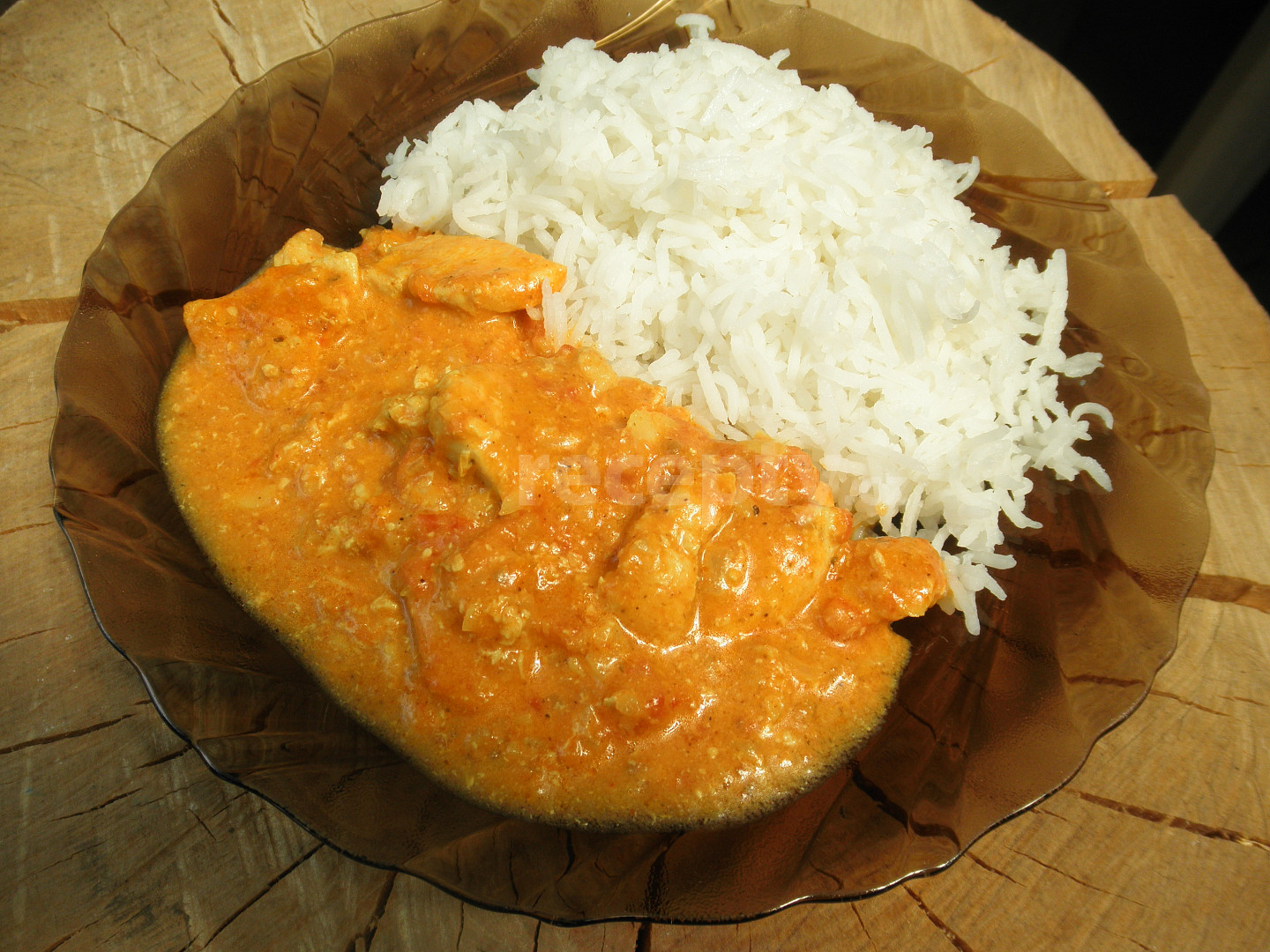 prsa kuřecí, smetana na vaření, rajče, cibule, koření kari, mandle plátkové, zázvor, semínka fenyklová, pepř čtyř barev, sůl, olej
