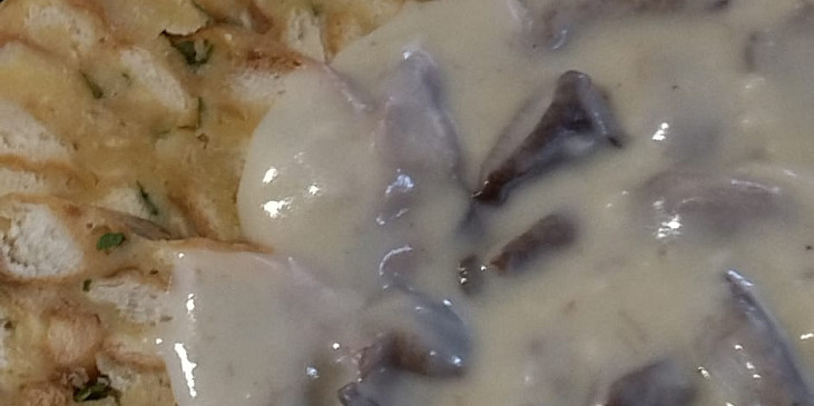 pečivo, vejce, žloutek, bílek, mléko, nať petrželová, mouka hrubá, květ muškátový, sůl, cibule, pepř mletý, sýr tvrdý, máslo, olej, vývar kuřecí
