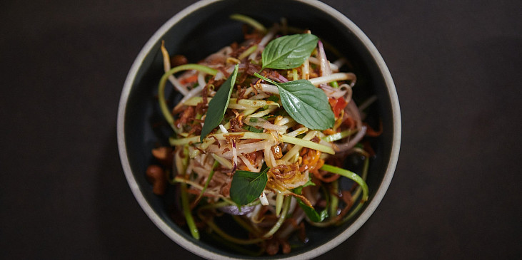 omáčka rybí, cukr třtinový, ocet, krém kokosový, rajče cherry, chilli paprika čerstvá, med, česnek, olej sezamový, mango, kedlubna, klíčky, cibule fialová, mrkev, bazalka čerstvá, cibule šalotka, koriandr, cibulka jarní, oříšky kešu