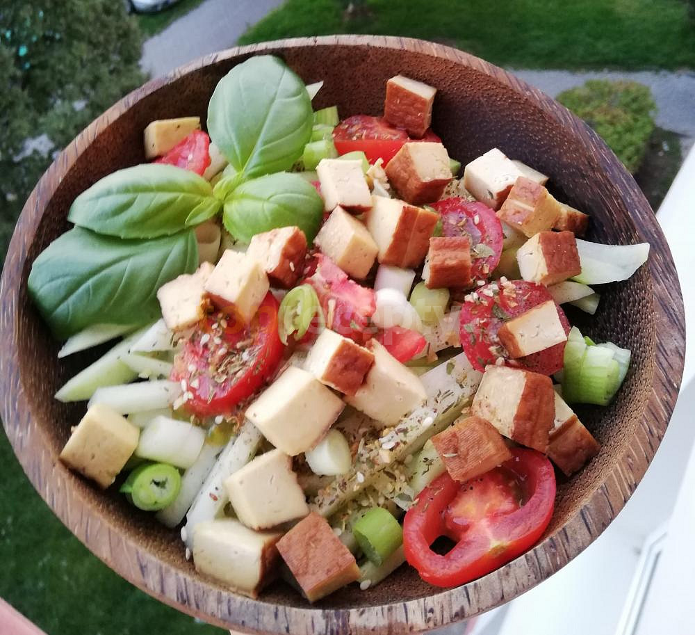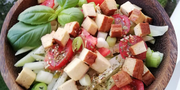 kedlubna, tofu uzené, rajče cherry, cibulka jarní, koření, semínka sezamová, olej olivový, olivy, bazalka čerstvá, sůl, pepř mletý