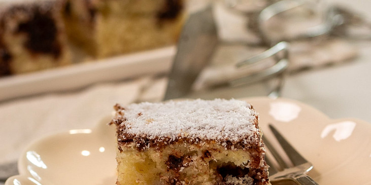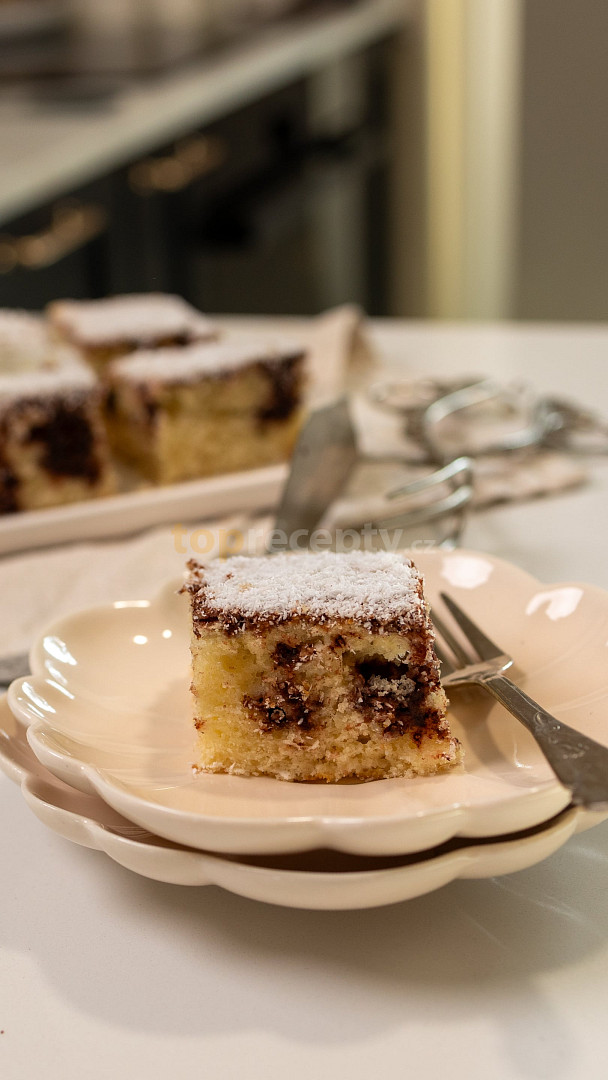 kefír, vejce, olej, cukr vanilkový, cukr krupice, mouka polohrubá, kypřící prášek do pečiva, kokos, máslo, cukr moučkový, kakao, voda, kokos