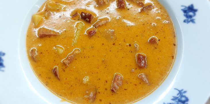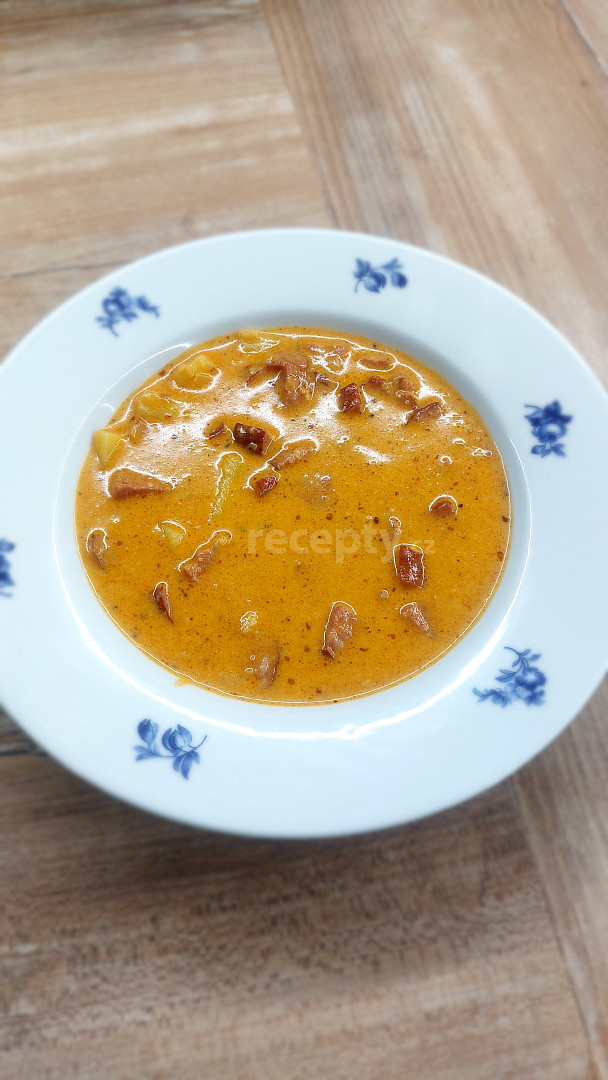 uzenina, smetana na vaření, brambory, cibule, česnek, paprika sušená sladká, majoránka, paprika sušená pálivá, pepř, sůl, mouka hladká, olej