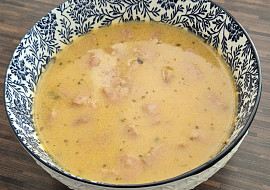 uzenina, smetana na vaření, brambory, cibule, česnek, paprika sušená sladká, majoránka, paprika sušená pálivá, pepř, sůl, mouka hladká, olej