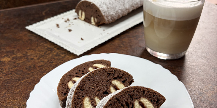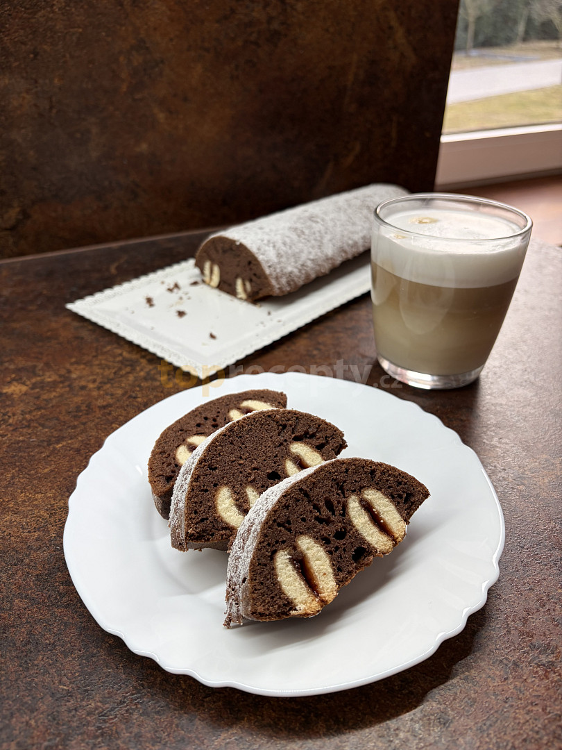 cukr moučkový, tuk hera, vejce, rum, mléko, mouka polohrubá, prášek do pečiva, kakao, piškoty, marmeláda, tuk, mouka hrubá