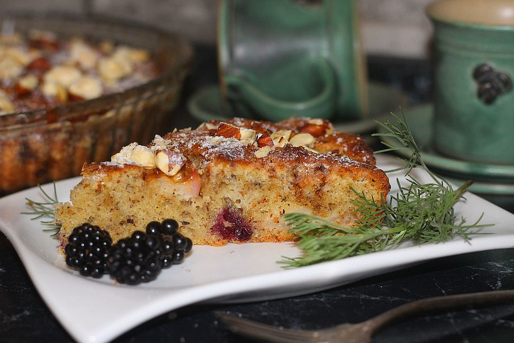 máslo, cukr krupice, cukr vanilkový, vejce, ořechy lískové mleté, mouka hladká, kypřící prášek do pečiva, máslo, mouka hrubá, ostružiny, jablko, jablko, skořice mletá, cukr hnědý, máslo, ořechy lískové, cukr moučkový