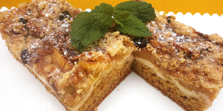 mouka polohrubá, cukr krystal, mléko, olej, vejce, kypřící prášek do pečiva, skořice, kůra citronová, cukr moučkový, máslo, mouka polohrubá, skořice, jablko, tvaroh měkký, rozinky, pudink vanilkový, cukr krystal, skořice