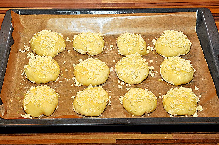 mléko, cukr krystal, droždí čerstvé, mouka hladká, sůl, kůra citronová, žloutek, olej, tvaroh, vejce, cukr moučkový, cukr vanilkový, pudink vanilkový, rozinky, vejce, drobenka, máslo, rum