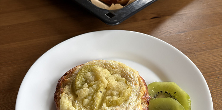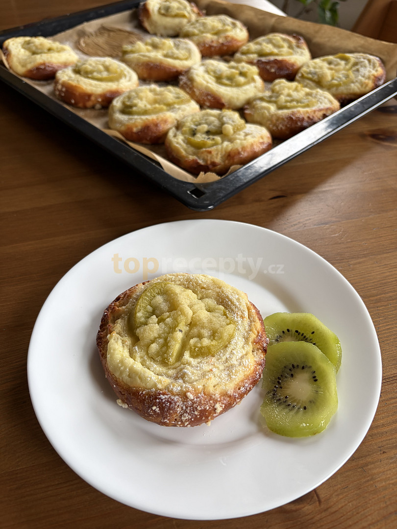 mouka hladká, olej, cukr krystal, droždí sušené, cukr vanilkový, žloutek, mléko, sůl, kůra citronová, tvaroh ve vaničce, cukr moučkový, cukr vanilkový, vejce, pudink vanilkový, kiwi, vejce, máslo, cukr moučkový, mouka hrubá