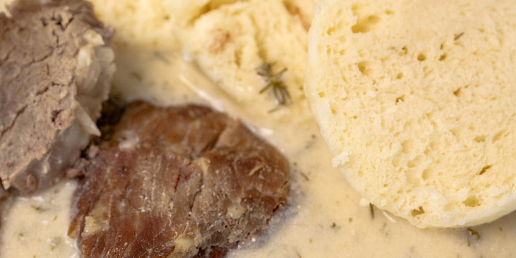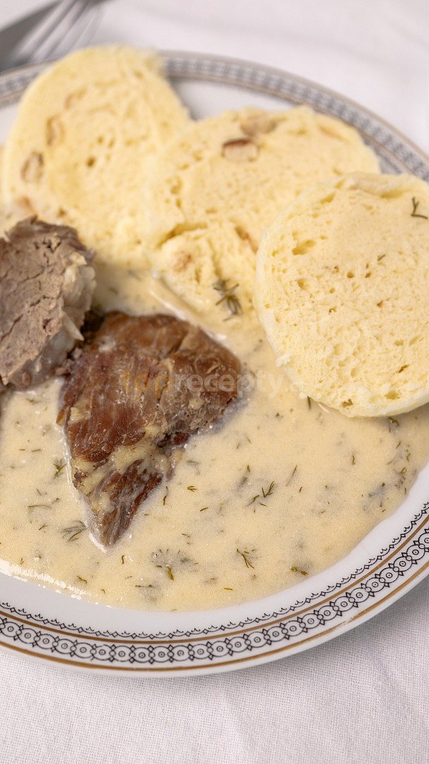 vývar hovězí, kopr, cibule, máslo, pepř černý, koření nové koření, tymián, mouka hladká, ocet, cukr krupice, smetana zakysaná, mléko, žloutek, sůl