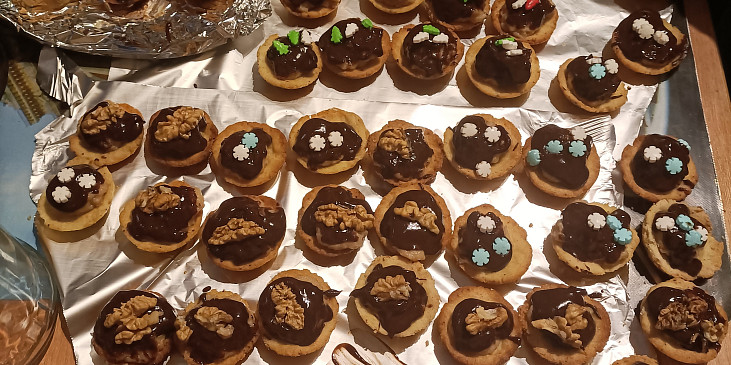 mouka hladká, cukr moučkový, tuk hera, žloutek, cukr krupice, ořechy vlašské, piškoty, mléko, rum, čokoláda na vaření, sádlo