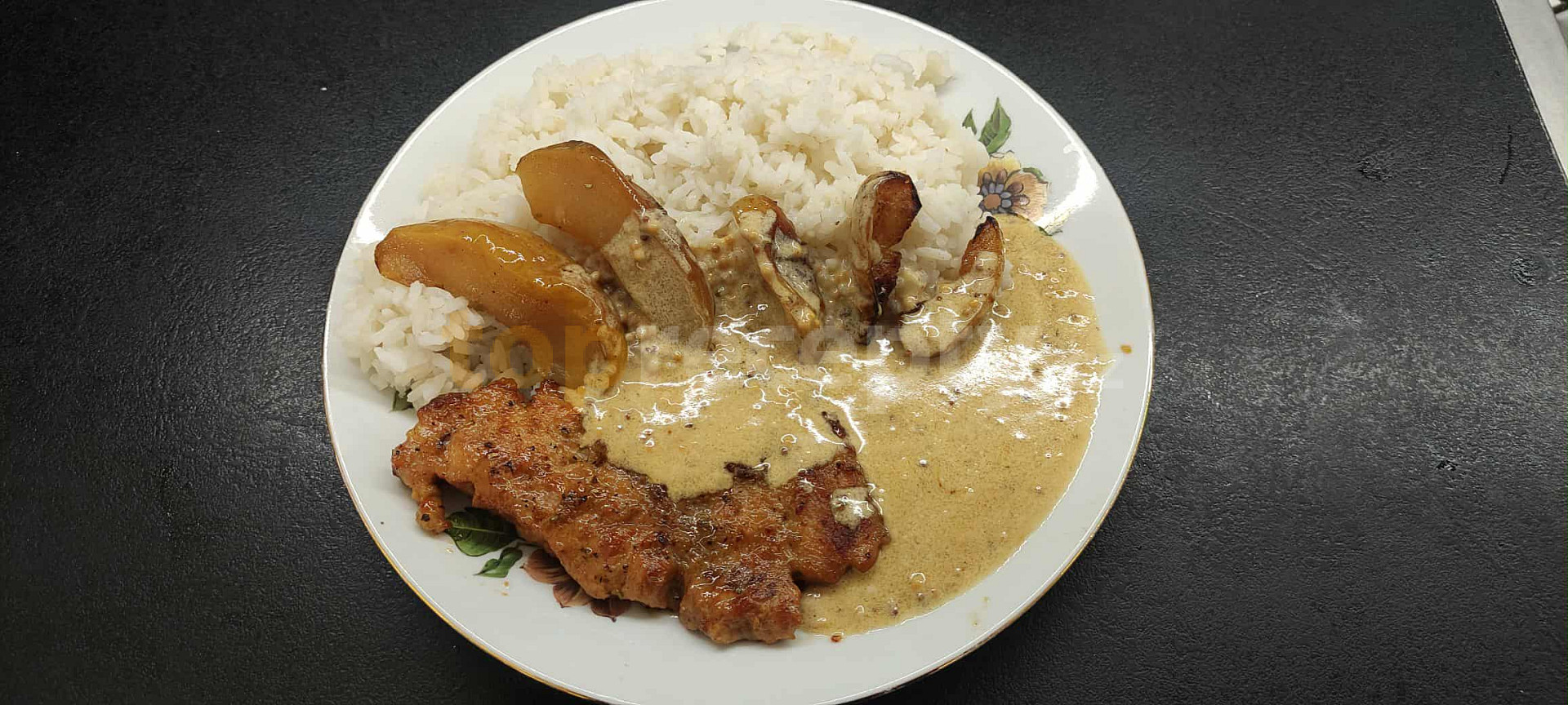 kotleta vepřová, sůl, pepř mletý, mouka hladká, jablko, šalvěj, cidr, olej olivový, máslo, hořčice hrubozrnná, smetana na vaření