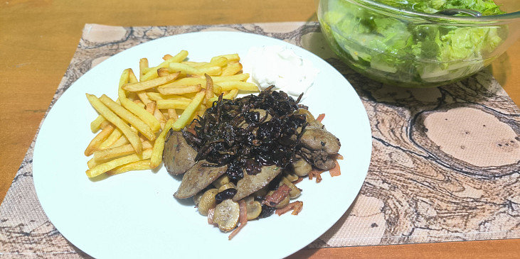 játra králičí, slanina anglická, olej, tymián, kmín mletý, sůl, pepř, cibule karamelizovaná, cibule bílá, cibule červená, máslo, olej, cukr třtinový, balsamico, brusinky sušené, sůl, pepř