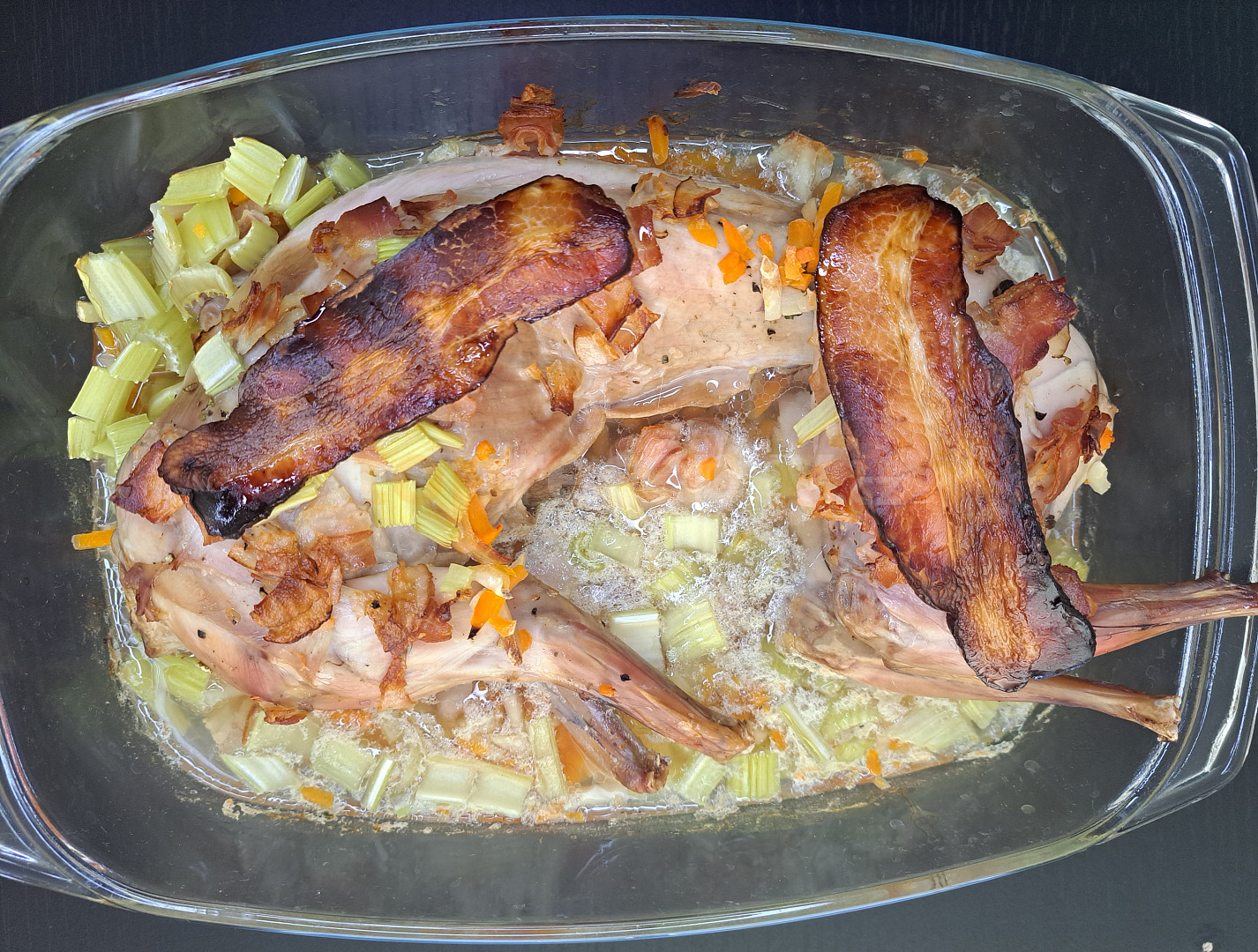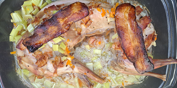 stehno králičí, mrkev, mrkev žlutá, celer řapíkatý, petrželka kořenová, víno bílé, slanina anglická, petržel, olej, bobkový list, pepř mletý, sůl, kmín drcený