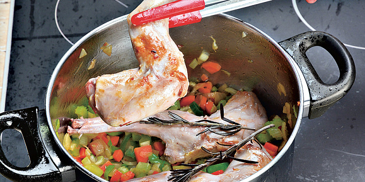 stehno králičí, víno bílé, vývar masový, smetana ke šlehání, mouka hladká, hořčice dijonská, cibule, česnek, mrkev, pórek, celer řapíkatý, olej, rozmarýn, sůl, pepř mletý