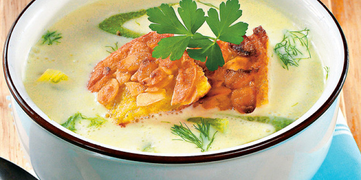 fenykl, brambory, cibule, máslo, mléko, bujón zeleninový, smetana na vaření, pepř bílý mletý, sůl, chléb toustový, vejce, mléko, mouka hladká, lupínky mandlové, máslo