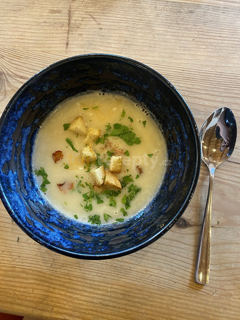 česnek, brambory, cibule, vývar zeleninový, smetana ke šlehání, sůl, pepř, olej olivový