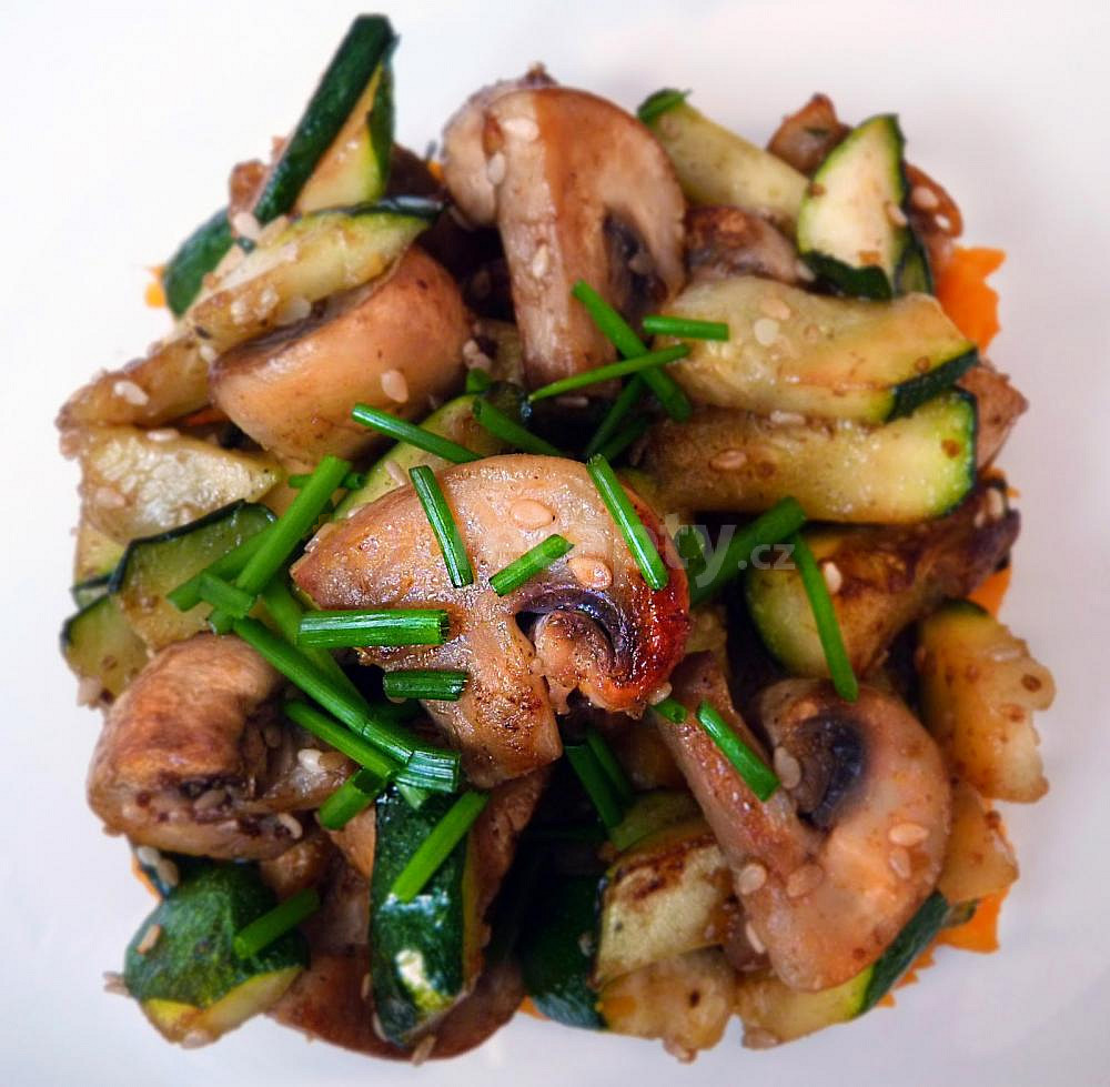 dýně hokkaido, cuketa, žampióny, smetana, pepř mletý, kmín mletý, sůl, olej, semínka sezamová, omáčka sojová tamari, pažitka