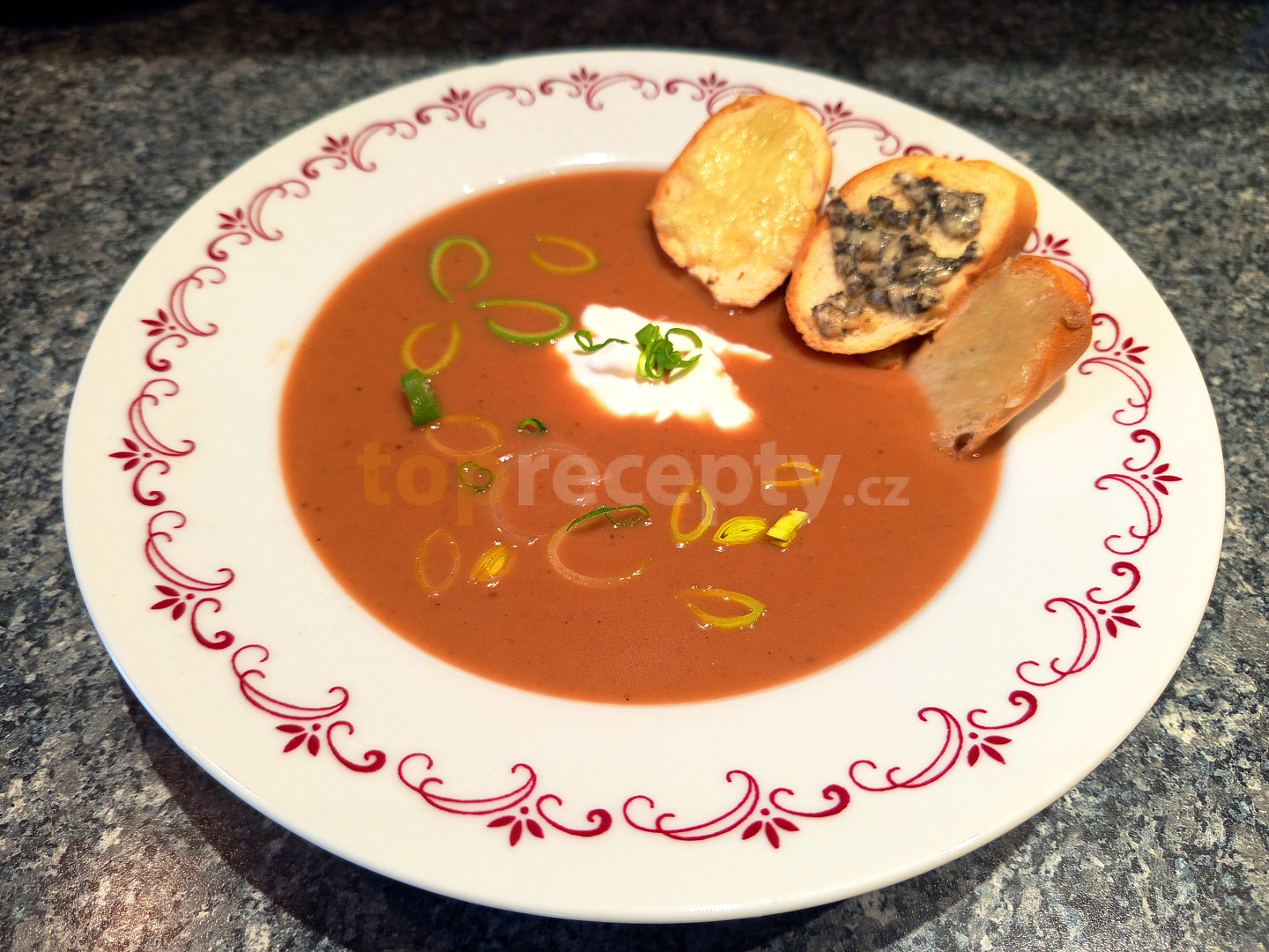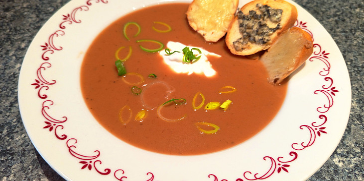 řepa červená, pórek, celer řapíkatý, brambory, cibule, vegeta, sůl, pepř mletý, olej, smetana zakysaná, rohlík, sýr niva, sýr mozzarella strouhaná, máslo