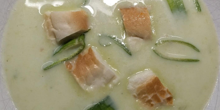 pórek, máslo, mouka hladká, vývar zeleninový, smetana na vaření, mléko, žloutek, pepř mletý, sůl