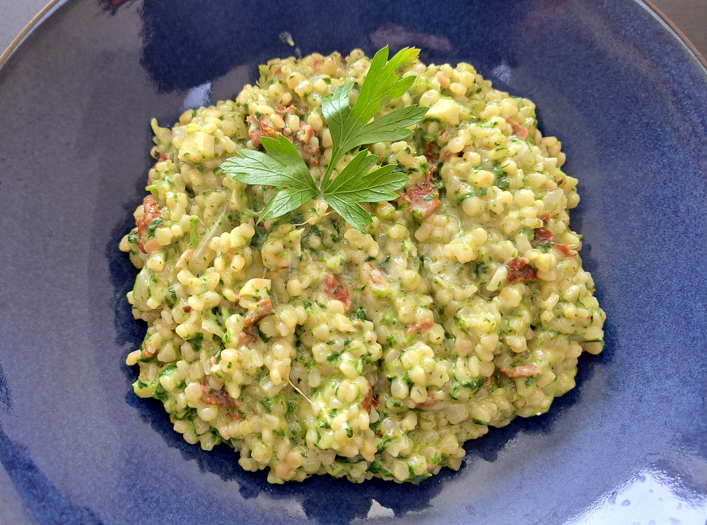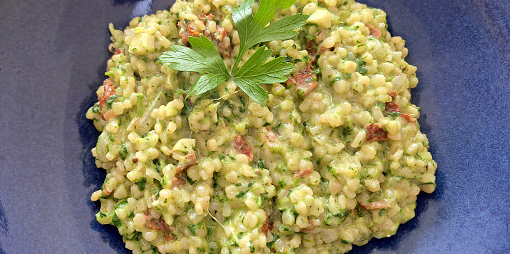 těstoviny tarhoňa, cibule, česnek, špenát mražený, rajče sušené, smetana ke šlehání, vývar zeleninový, sýr parmazán strouhaný, olej olivový, sůl, pepř mletý, čerstvé bylinky