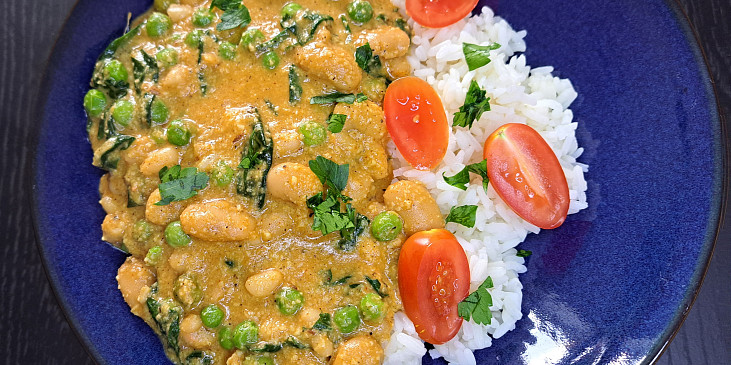 cibule, česnek, zázvor, protlak rajčatový, oříšky kešu, mléko kokosové, fazole bílé, hrášek mražený, špenát baby, petrželka, koření kari, paprika sušená sladká, kmín drcený, bylinky sušené, šťáva citronová, chilli, sůl, pepř mletý, olej olivový, rýže, rajče cherry