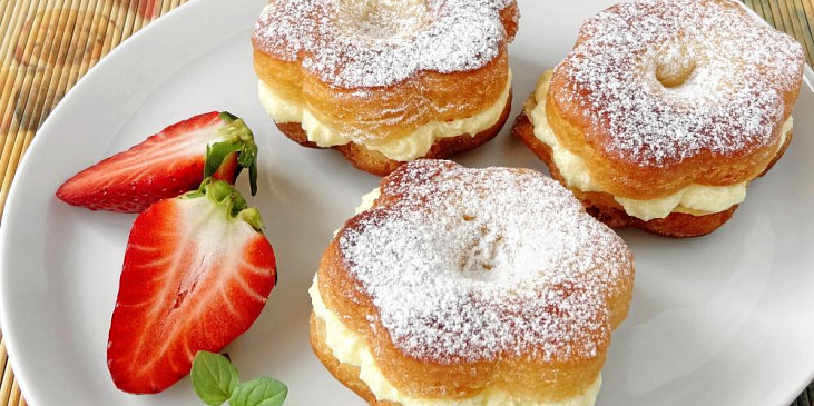 mouka polohrubá, vejce, mléko, droždí čerstvé, cukr krupice, máslo, rum, kůra citronová, sůl, máslo, cukr moučkový, mléko, mouka polohrubá, cukr vanilkový, mouka hladká, olej, cukr moučkový
