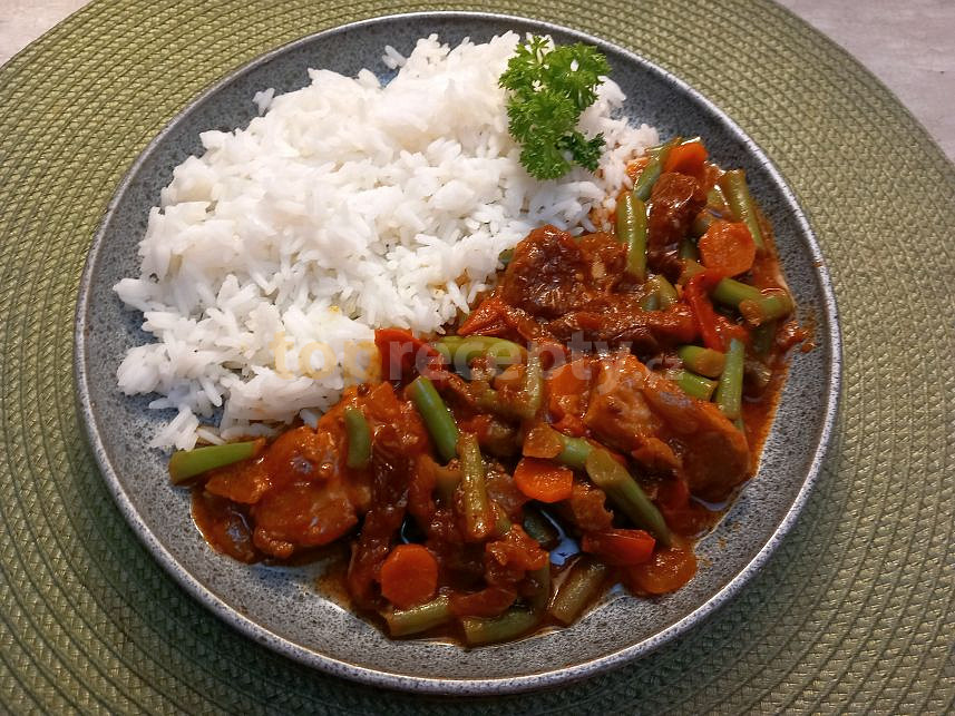 krkovice vepřová, sádlo, cibule, mrkev, rajče cherry, protlak rajčatový, rajče sušené v oleji, olej ze sušených rajčat, česnek, lusky fazolové, vývar masový, sůl, pepř mletý
