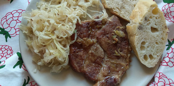 zelí sterilované, cibule, česnek, kmín celý, pepř mletý, sůl, koření nové koření, bobkový list, petrželka, libeček, víno bílé, hořčice plnotučná, krkovice vepřová, mouka hladká, sádlo