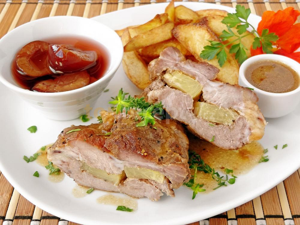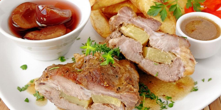 krkovice vepřová, kompot ananasový, kompot ananasový, víno červené, mouka hladká, olej, vývar masový, šťáva citronová, sůl, koření steakové