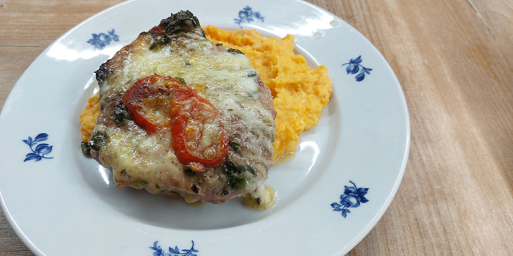 krkovice vepřová, sýr mozzarella, rajče cherry, česnek mědvědí, olej olivový, sůl mořská, citron, olej olivový, sůl, pepř