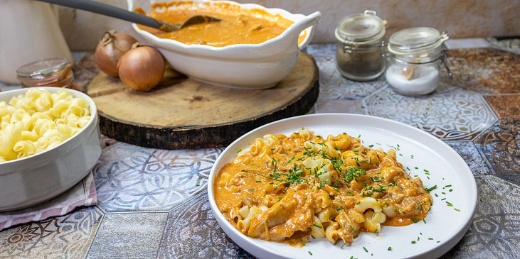 prsa krůtí, olej olivový, máslo, česnek, cibule šalotka, mouka hladká, paprika sušená sladká, vývar drůbeží, smetana ke šlehání, sůl, pepř mletý, petrželka