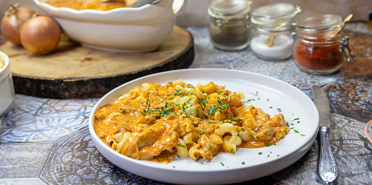 prsa krůtí, olej olivový, máslo, česnek, cibule šalotka, mouka hladká, paprika sušená sladká, vývar drůbeží, smetana ke šlehání, sůl, pepř mletý, petrželka