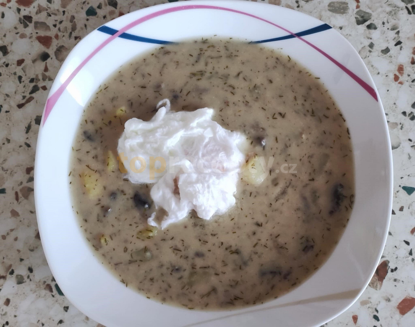 žampióny, brambory, vývar hovězí, smetana ke šlehání, máslo, mouka hladká, kmín celý, cukr třtinový, ocet, kopr čerstvý, sůl, pepř mletý, vejce, ocet