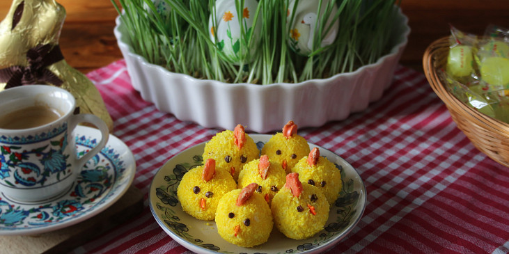 salko, máslo, kokos strouhaný, mandle, kokos strouhaný, potravinářské barvivo žluté, čokoláda bílá, čokoláda hořká, tuk ztužený, potravinářské barvivo, corn flakes, zdobení