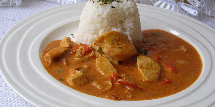 kuře, bobkový list, koření nové koření, pepř, sůl, cibule, máslo, olej, slanina, kapie, paprika sušená sladká, vývar masový, smetana ke šlehání