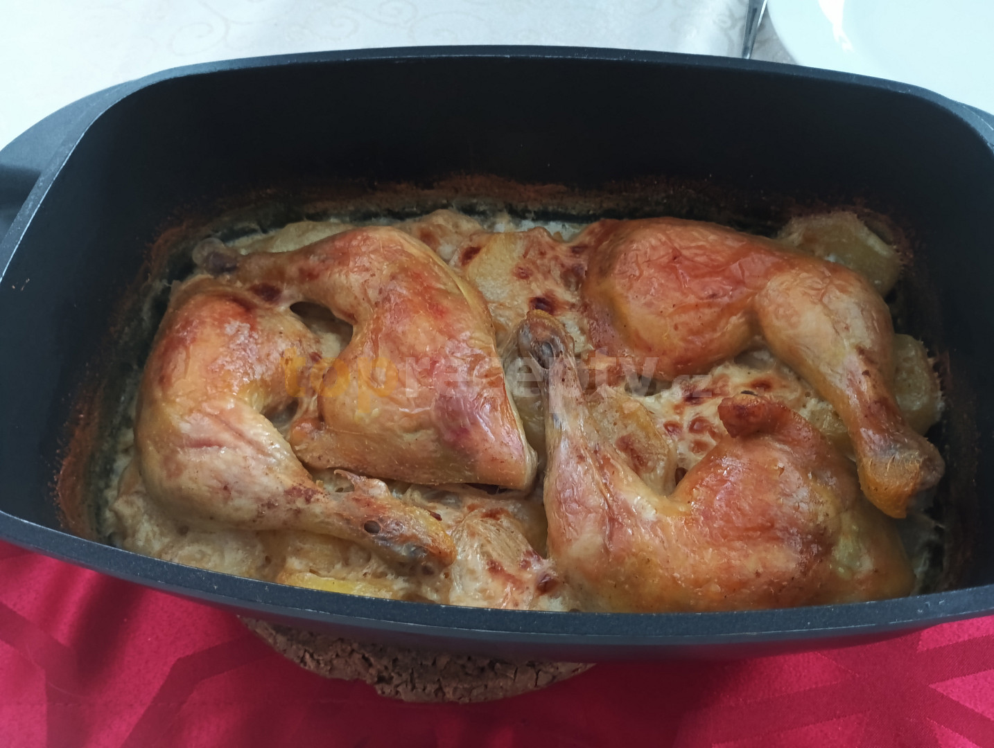 stehno kuřecí, smetana na vaření, brambory, sůl, kmín mletý, cibule, máslo