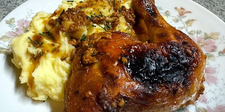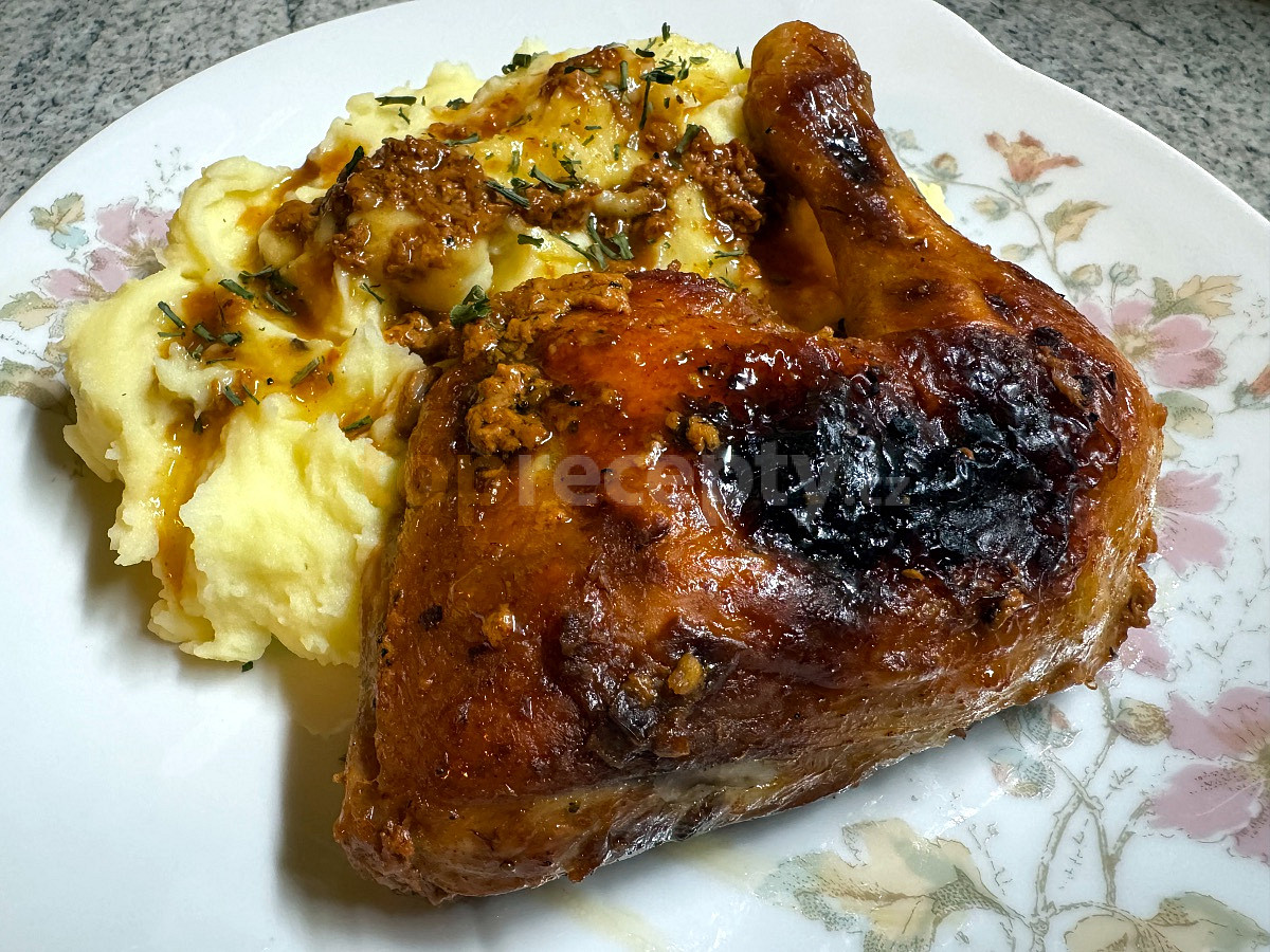 stehno kuřecí, podmáslí, česnek, paprika sušená sladká, povidla švestková, omáčka sojová, sůl, pepř